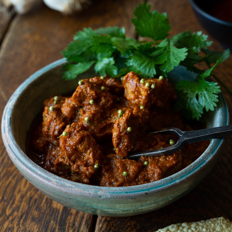 Marinierte Rindfleischstücke, an einer scharfer braunen Currysauce